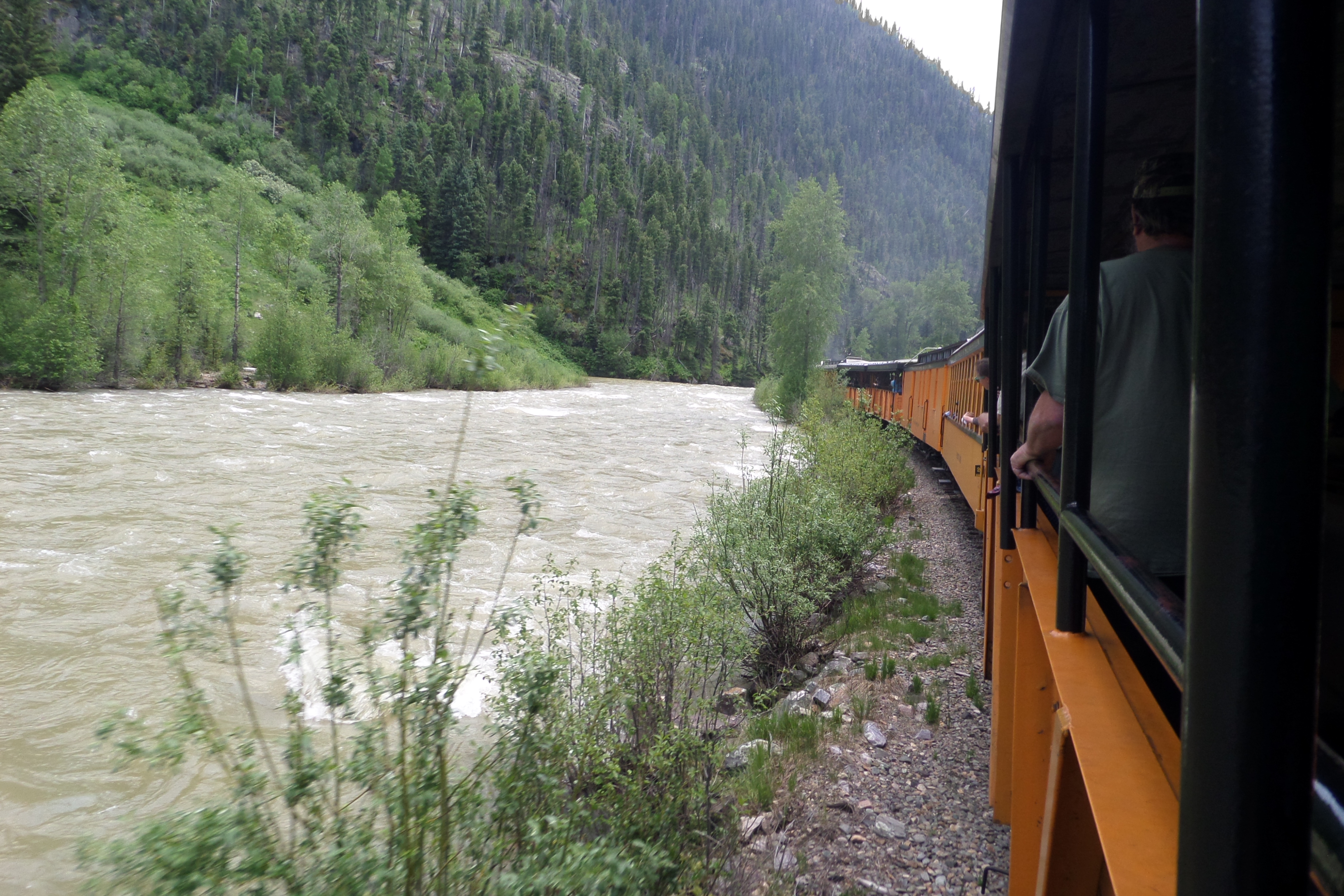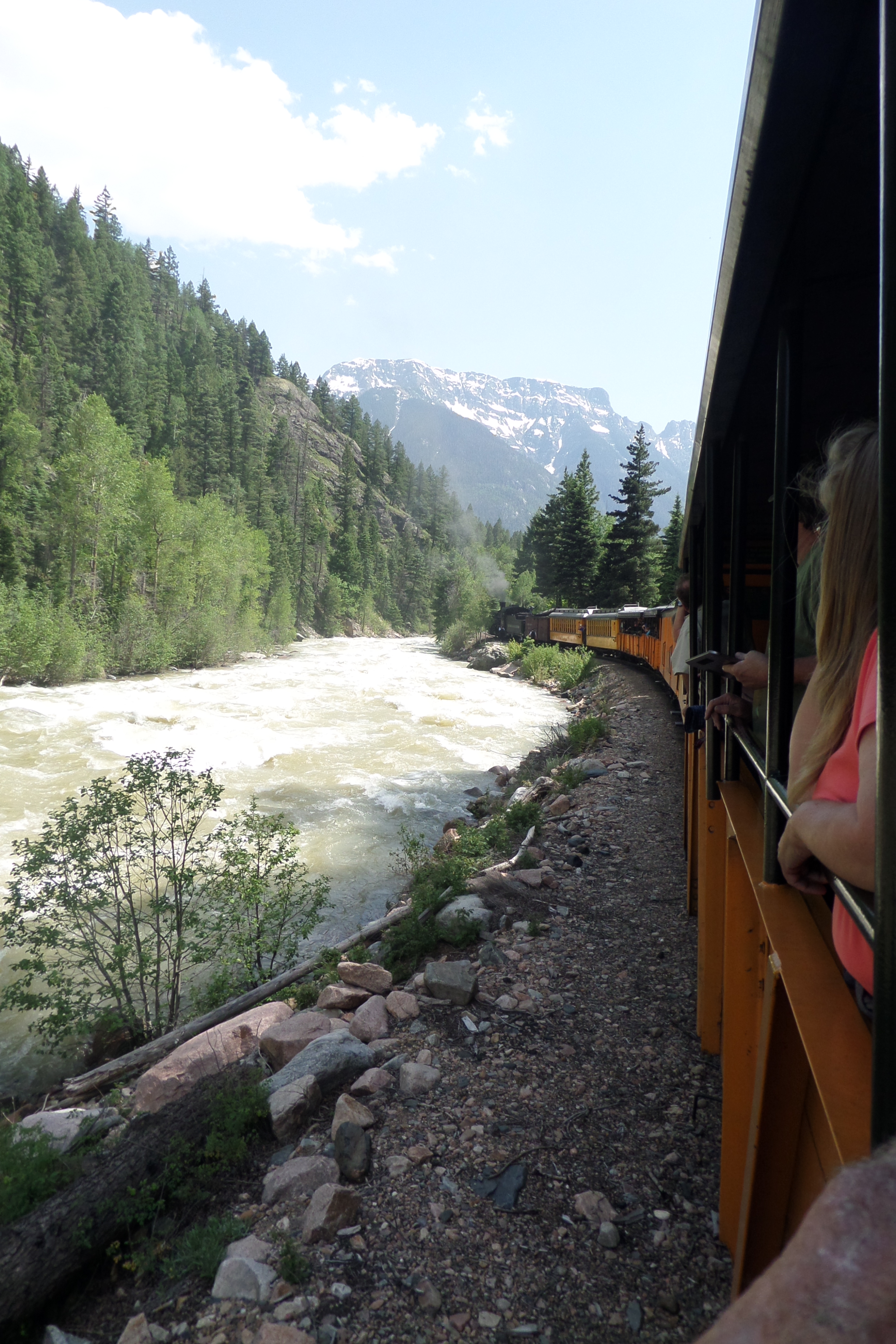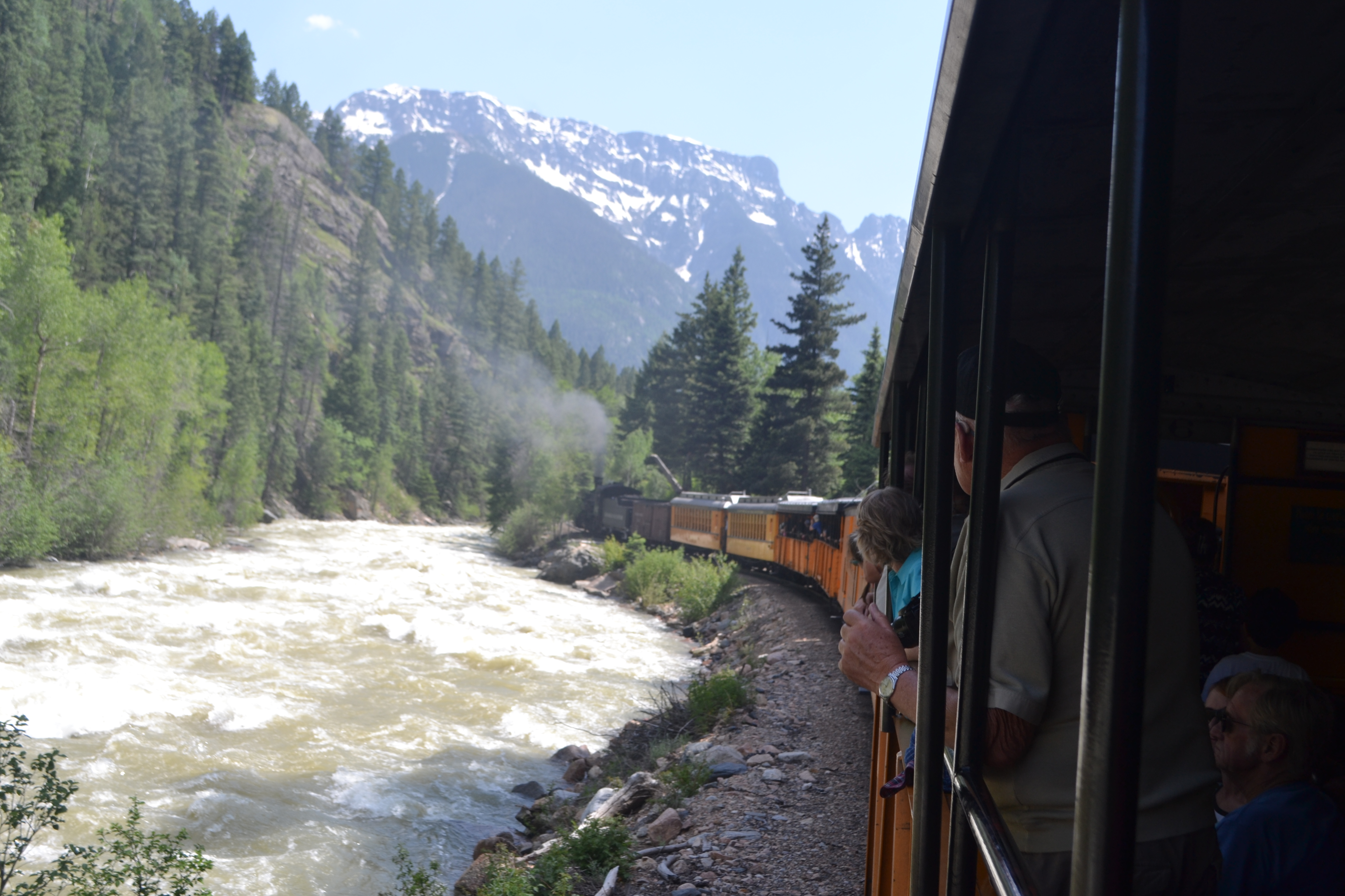 It is a long time since we have had coal soot in our eyes . When I was a kid when the steam passenger trains ran through Donald and we were going to Melbourne we would put our heads out the window and next thing we would be rubbing our eyes . Well guess what . In an open carriage and the engine climbing steeply up the Animas river valley in the San Juan National Park, We got covered in soot .