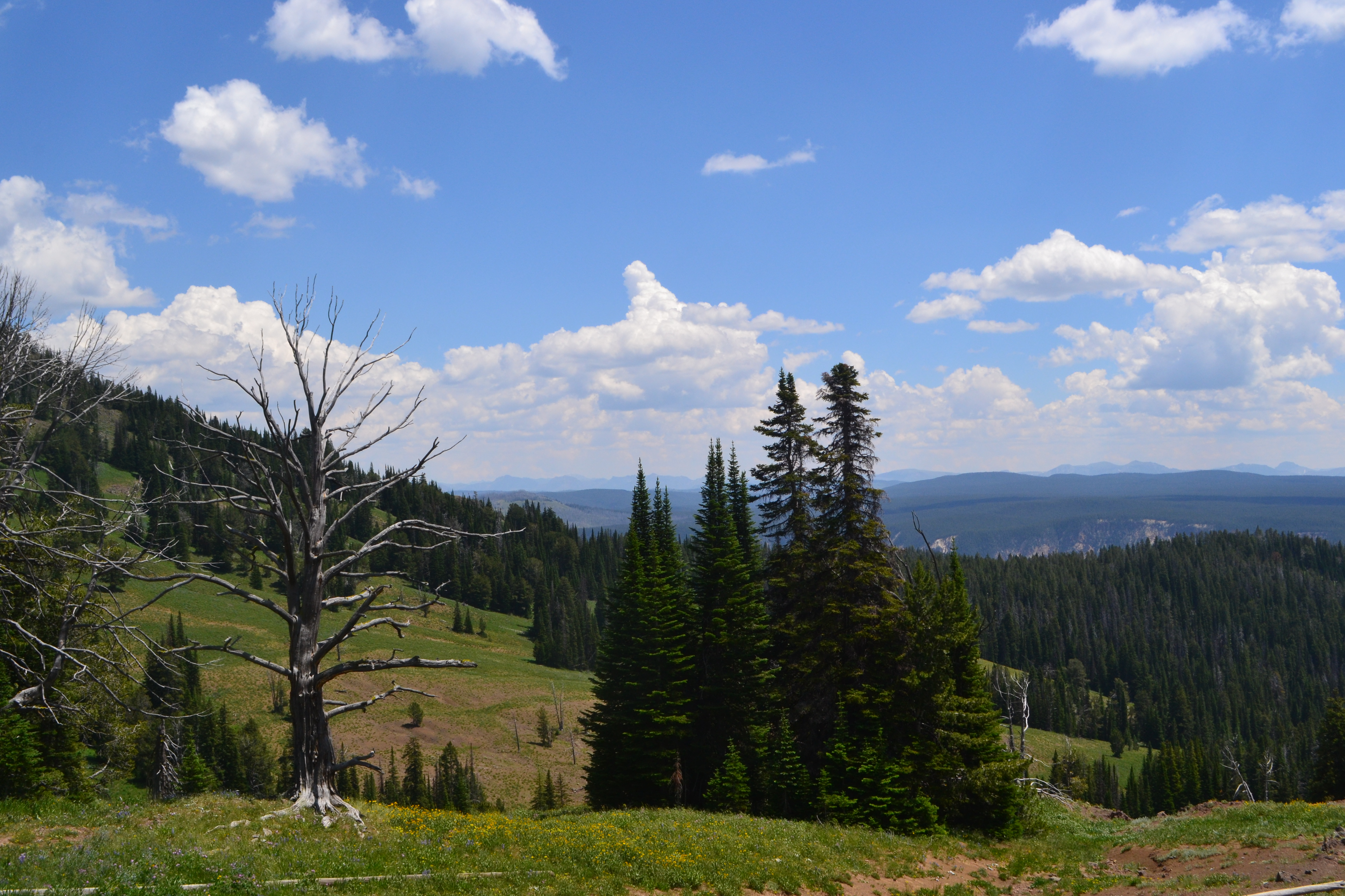 Moving on, Ian watching the time, `I want to go for a walk’ – not sure that will work!?! We drive on diverting up to Blacktail Plateau – will we see a bear? We want to see more animals mainly a bear. – no bears but wildflowers – the higher hills/pastures/open grasslands are covered in beautiful wildflower s of all colours. – but no bears. Back on the main road and look a hundred cars are stopped on the edge of the road. Great a bear! We arrive on the edge of the crowd and there is a black bear – look very hard – look again – oh I can just make him out – a hundred yards away. We are not allowed any closer. We felt let down – but we take photos. A commanding voice behind us tell us to step back we are too close!!!!! And if you are parked on the edge of the road there will be a $100,000.00 fine or 12 year jail sentence!! Party over, as we moved back to our cars to move them.