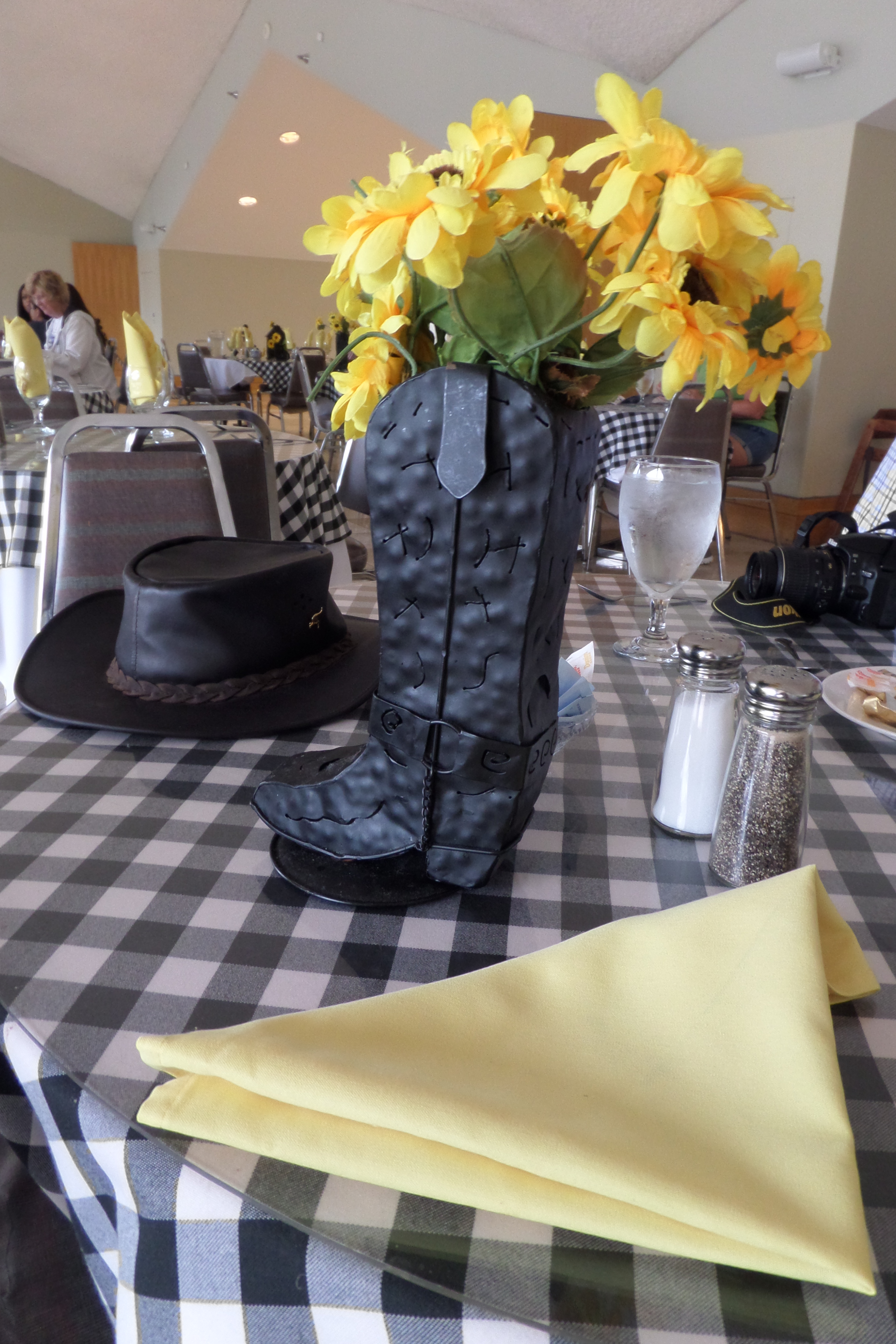 Alison had a feeling of excitement as she was surrounded by really beautiful things – the art, the exhibits, the gardens and even the café. The décor was yellow and black – sunflowers in black cowboy boot, yellow serviettes as seen in the photos. The smorgasbord luncheon was delicious. She did not want to leave. – sign of a very special morning.