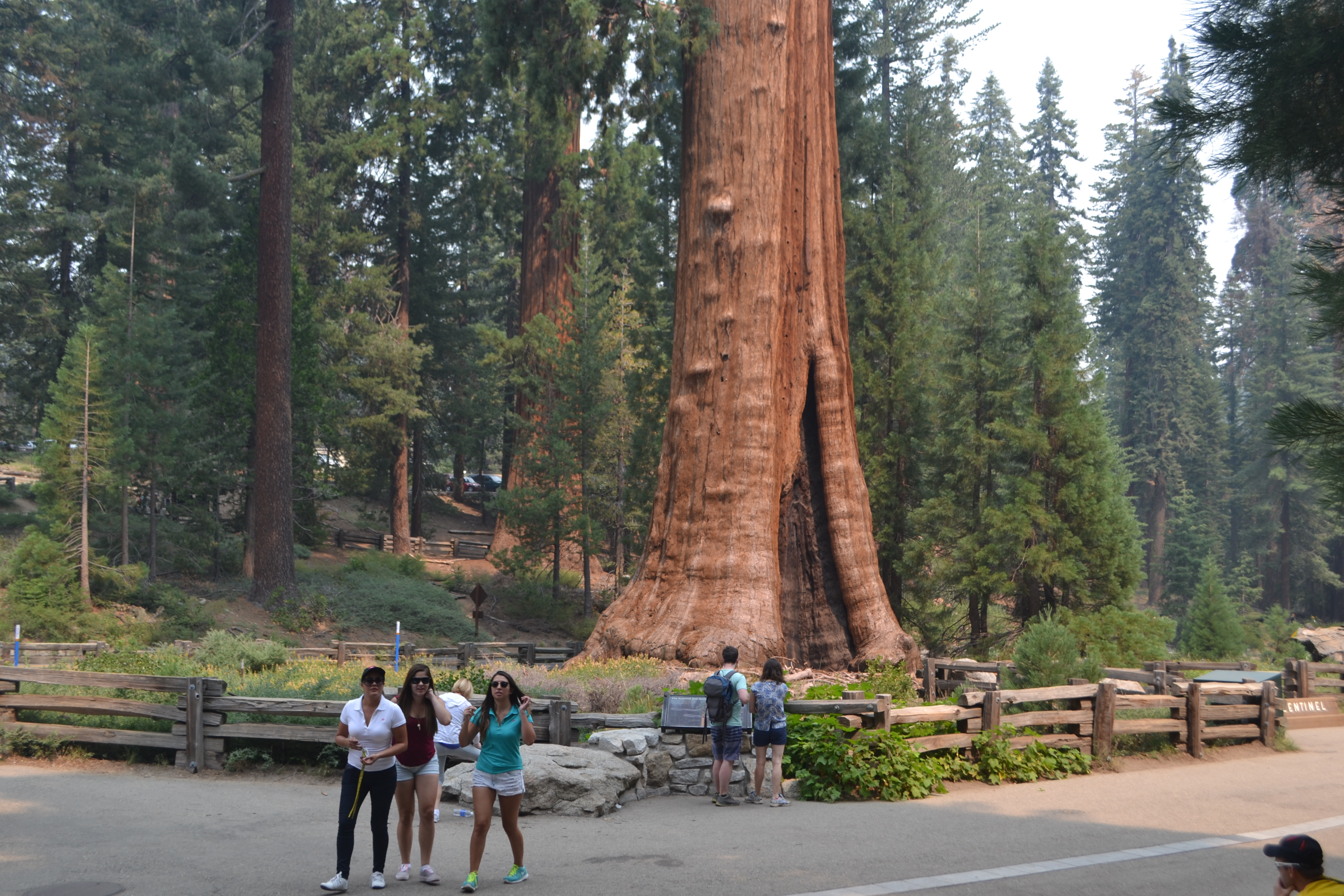 Today was the day at 6000 feet. We have just enjoyed the Sequoia National Park. We had trouble believing that we were going to see big trees as we drove toward our destination. One minute we are suffering with the people as the 4 year drought is very evident – no feed – brown dirt – moisture starved trees. Next, are we in California? or in Mildura? – orange groves, grape vines, other` drip watered` fruit trees – then back to barren paddocks. Up and up we climbed. First the pine trees, then the huge granite boulders and then what should have been brilliant photographic scenes of valleys, running streams of water and high mountains were actually just smoke hazed apparitions, Not many miles away in King Canyon National Park a huge fire was burning. Later in the day we took photos of `atomic bomb` smoke clouds.