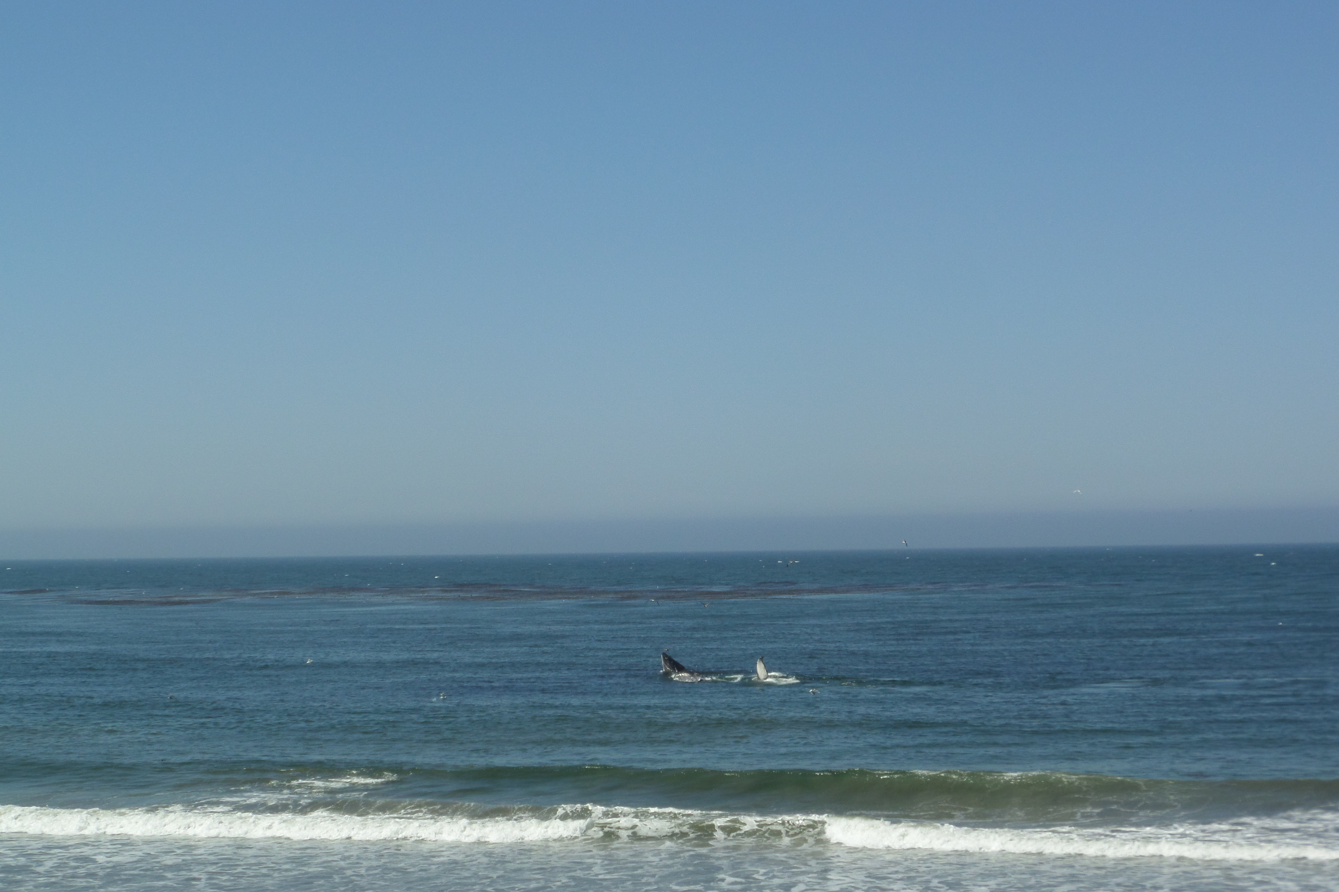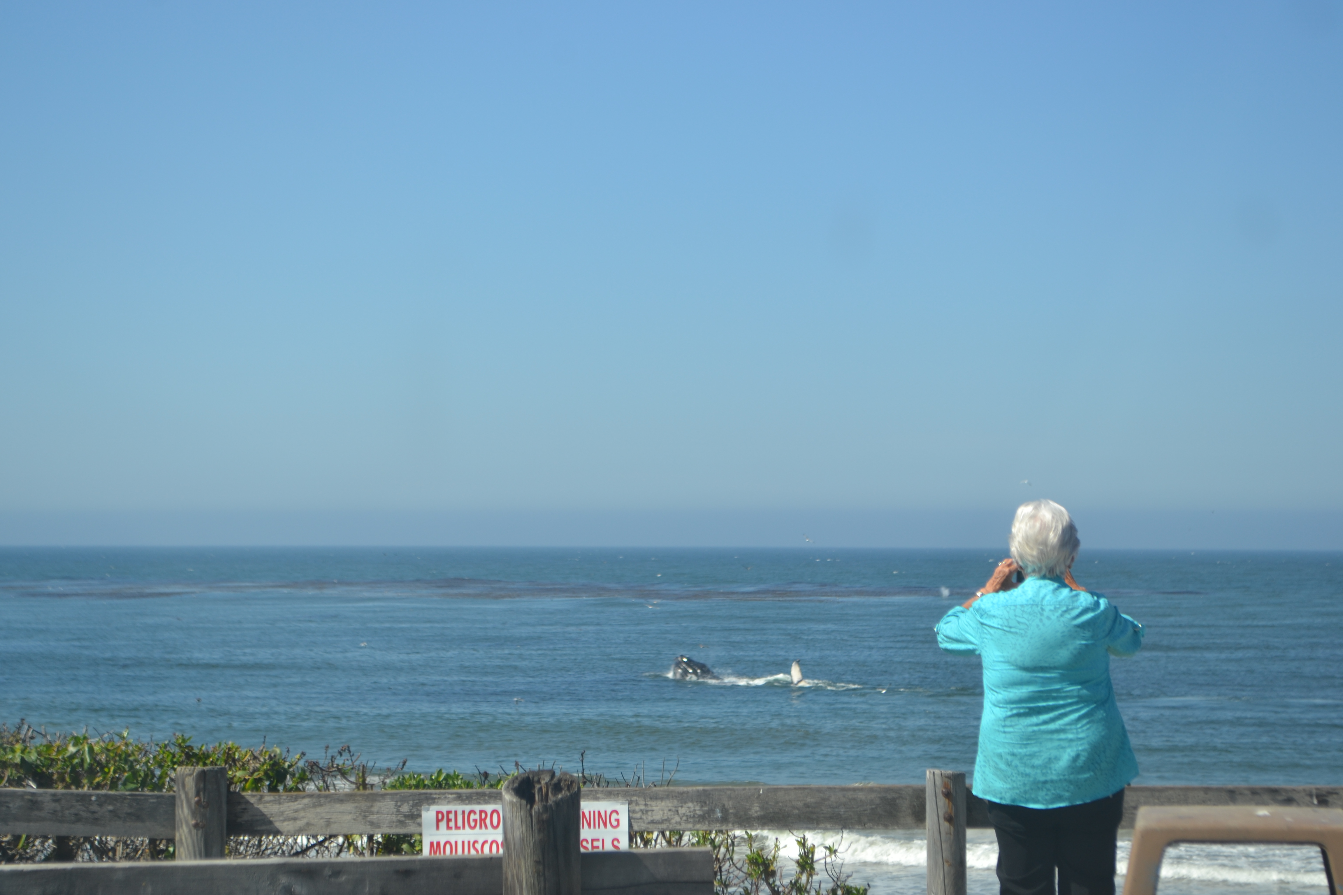 I noticed hundreds of seagulls circling over the sea. Hundreds more on the beach watching and waiting, for what I did not know. I observed, there was far more bird life than on our beaches at home. I turned to return when I noticed a spout of water. Is it really? A whale. Yes. Then it breeched! I was really excited, was I really seeing whales close into the beach? Well, 400 metres from the beach, still at times even closer. I walked along and talked to a young man who had binoculars. He told me he thought there were 3 or 4 playing in the shallows or resting from travelling. The birds were circling the whales as they were probably stirring the fish and other food source, for them. After looking through the binoculars for a closer look, I hurried back to our room, packed the car so Ian could see the whales. We saw one. We snapped photo after photo hoping that we would catch a photo of the whale on the surface and we were lucky. Thrilled with the privilege of seeing these giants of the deep.